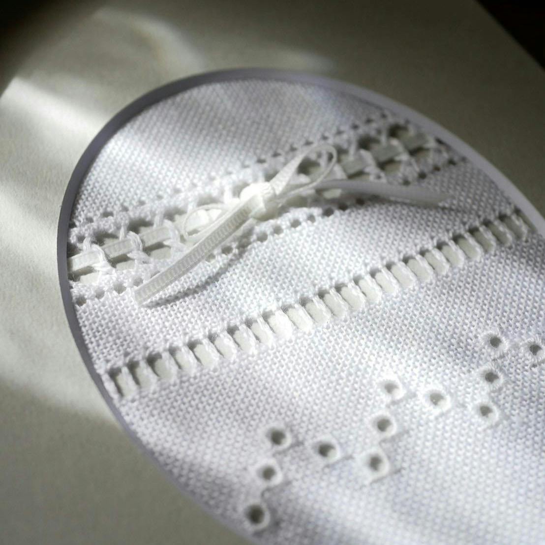 穴が空いた柔らかいチュールレースにチクチクとひと針ひと針、手刺繍を施していきます。