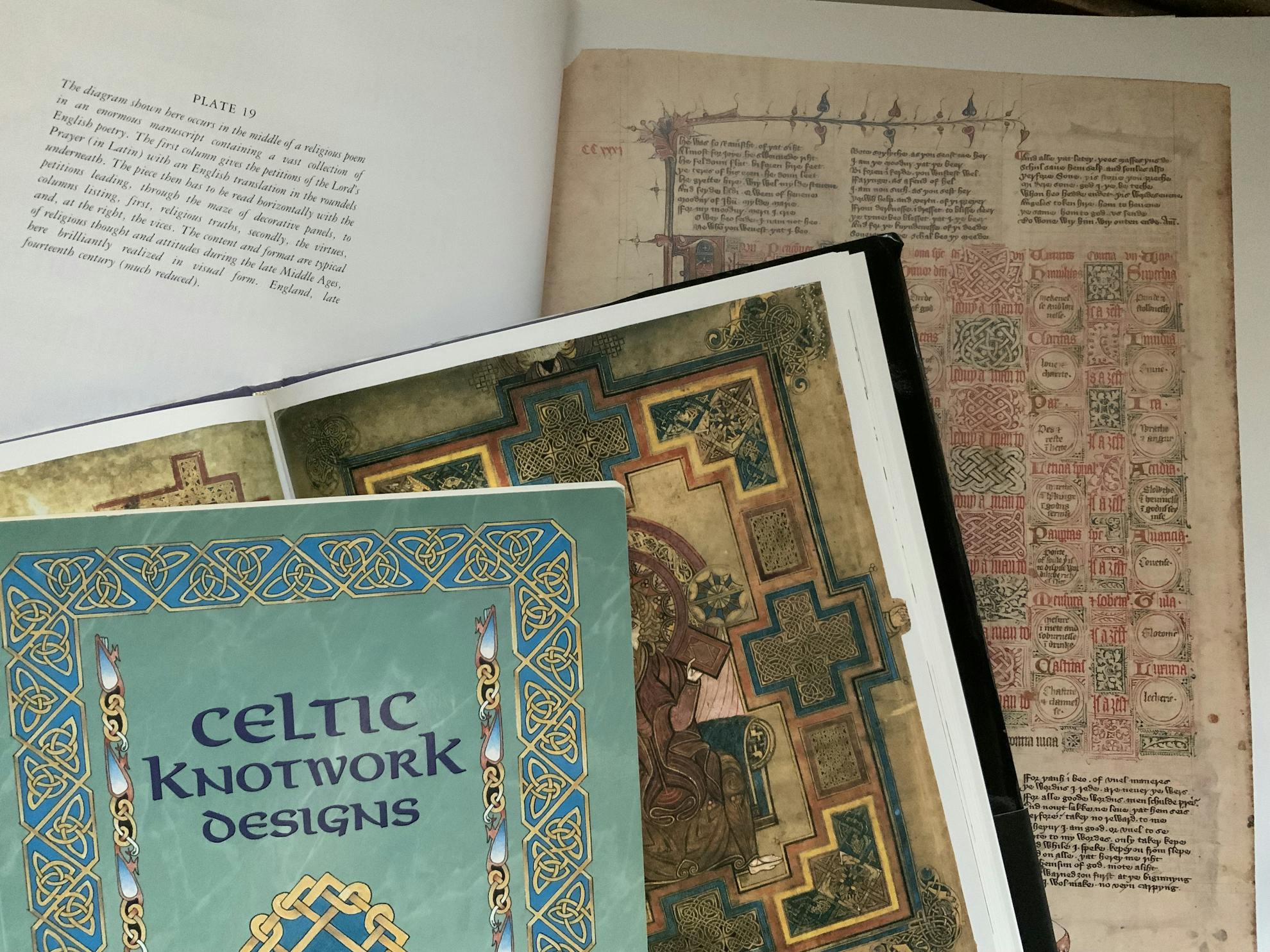 左はケルズの書の解説本。ケルト模様がたっぷり描かれたています。歴史も学びたい、美しいカリグラフィーの魅力も好きな人におすすめな本です